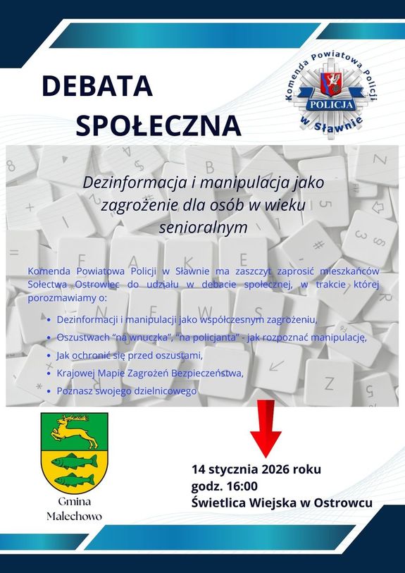 Komendant Powiatowy Policji w Sławnie insp. Paweł Molis zaprasza do udziału w debacie „Dezinformacja i manipulacja jako zagrożenie dla osób w wieku senioralnym”. Debata odbędzie się w dniu 14 stycznia 2026 roku o godzinie 16:00 w świetlicy wiejskiej w Ostrowcu.